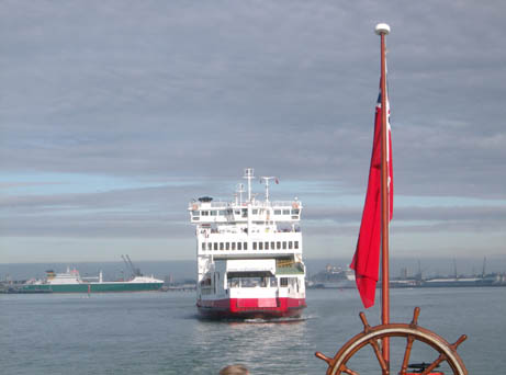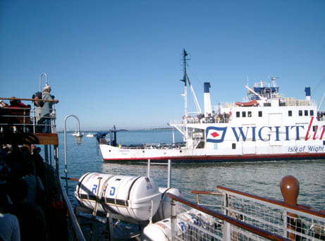 Visibility was excellent for the trip with distant views of the Isle of Purbeck as we rounded The Needles. Freshwater Bay, Blackgang, St Catherine's Head, Ventnor, Bonchurch, Shanklin and Sandown fell behind the steamer in turn. Rounding Bembridge Ledge, some small liquid gas tankers were passed at anchor. Finally, back to Yarmouth where we berthed port side to as the tide was flooding. On the run back to Portsmouth we saw the super ferries Normandie and Pride of Bilbao enter the harbour ahead of us.