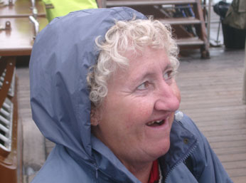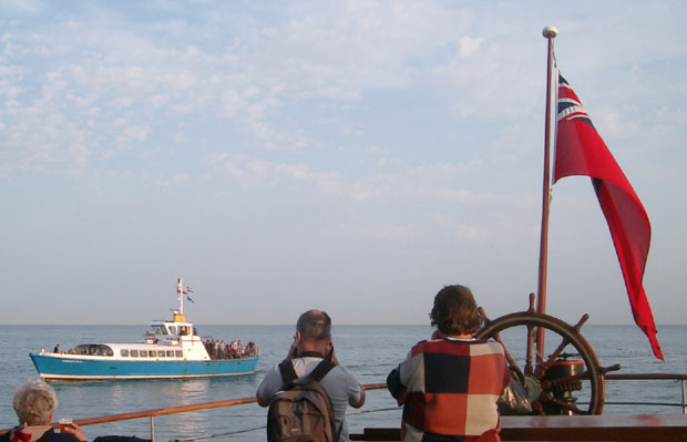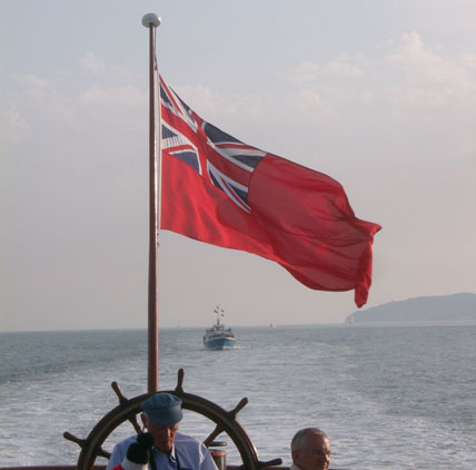 Thursday was due to take the paddler to Yarmouth, Bournemouth (with Dorset Belle connection for Swanage) and for a non-landing cruise to Lulworth Cove. Heavy rain had caused major traffic disruption in Portsmouth and Waverley waited 15 minutes for a coach party which had been held up. Finally we followed HMS Atherstone out of the Harbour and turned to starboard. After Yarmouth there were over 350 on board but this was to remain our complement for longer than planned. Leaving the Solent we encountered a long but persistent swell which gently rolled the steamer on her way westward. On arrival at Bournemouth, this led to unacceptable motion and Captain Colledge reluctantly decided that he was unable to land or embark passengers.