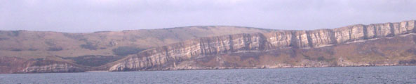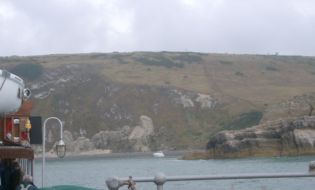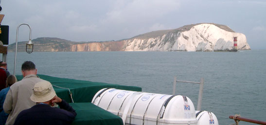 Waverley steamed across the bay to Durleston Head and then hugged the coast to Lulworth. Here she swung out to sea to line up for an approach to the Cove. As we now had plenty of time in hand (as the schedule allowed for calls at both Bournemouth and Swanage), the paddler gave a further cruise viewing the coast as far as Weymouth and then the outside of Portland Harbour. Here we passed HMS Tyne before turning back east on a direct course for The Needles.