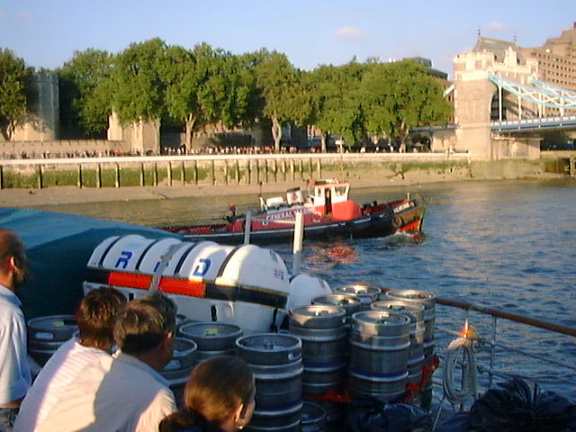 Tidal conditions were no more favourable on Saturday when the planned sail was from Ipswich, Walton and Clacton to Tilbury, via the Upper Pool of London. Purser Jim McFadzean informed us on boarding that no call would be possible at Clacton, and that the additional distance around the sandbanks meant that our arrival at Tilbury would be some 45-60 minutes late. A very good number joined at Ipswich, using the usual bus shuttle service from Tower Ramparts Bus Station and the Railway Station. It was very hazy steaming down the Orwell and on to Walton Pier to pick up some more passengers. Clacton passengers were transferred by coach to join the ship at Southend. The cruise was given under unbroken blue skies, with the only shade seeming to come from the Orwell and Queen Elizabeth (M25) Bridges. Passing Greenwich, where a river festival was taking place, the replica three-masted man-o'-war Grand Turk was preparing to fire a 'broadside,' which we later heard echoing up the river.