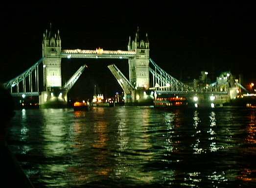 The paddler passes through Tower Bridge on 24 September 2000 Waverley's funnels are caught in the Bridge's floodlights as she passes between the towers followed by two Thames passenger launches, one on either side. |