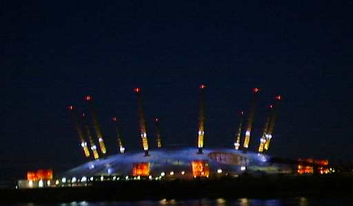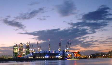 The Millenium Dome with the Canary Wharf towers beyond, to its left. |
