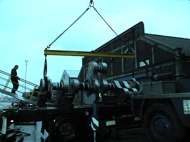 The crankshaft is loaded to the truck for its journey to Manchester. We will see its return in around two months with all journals and pins ground true.