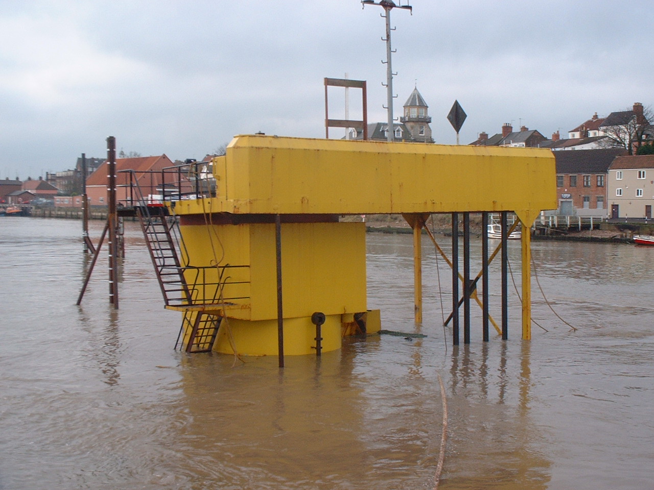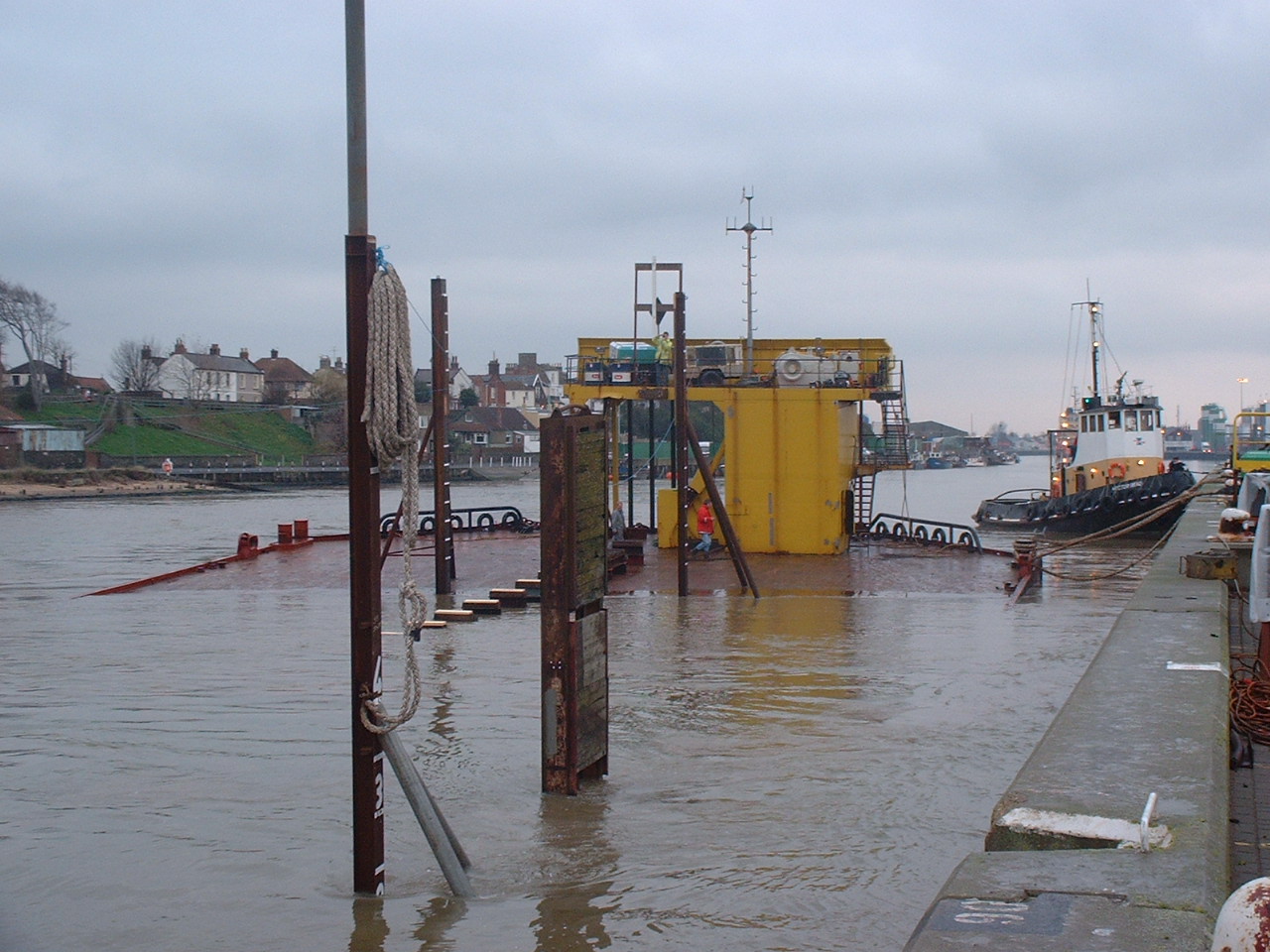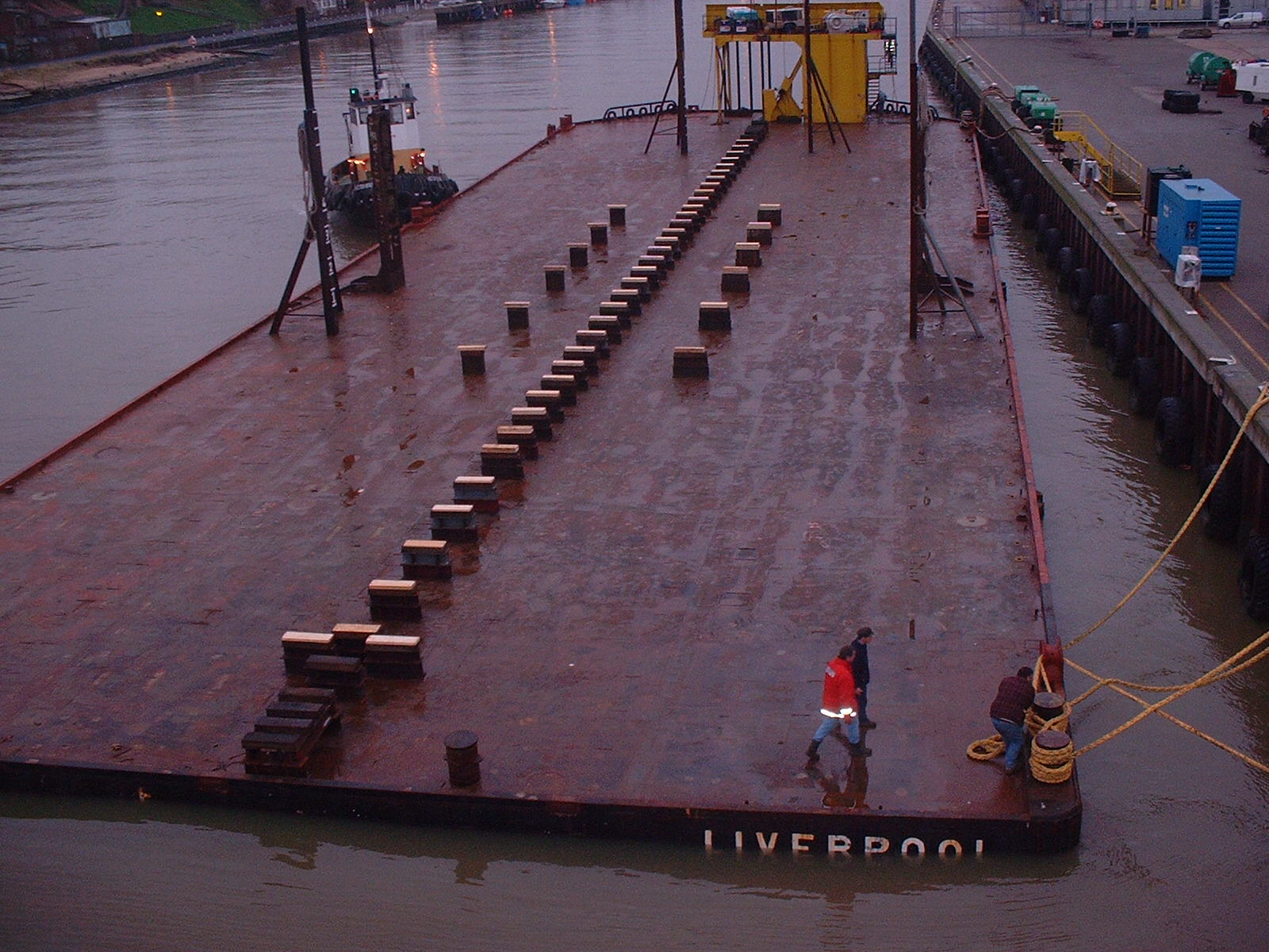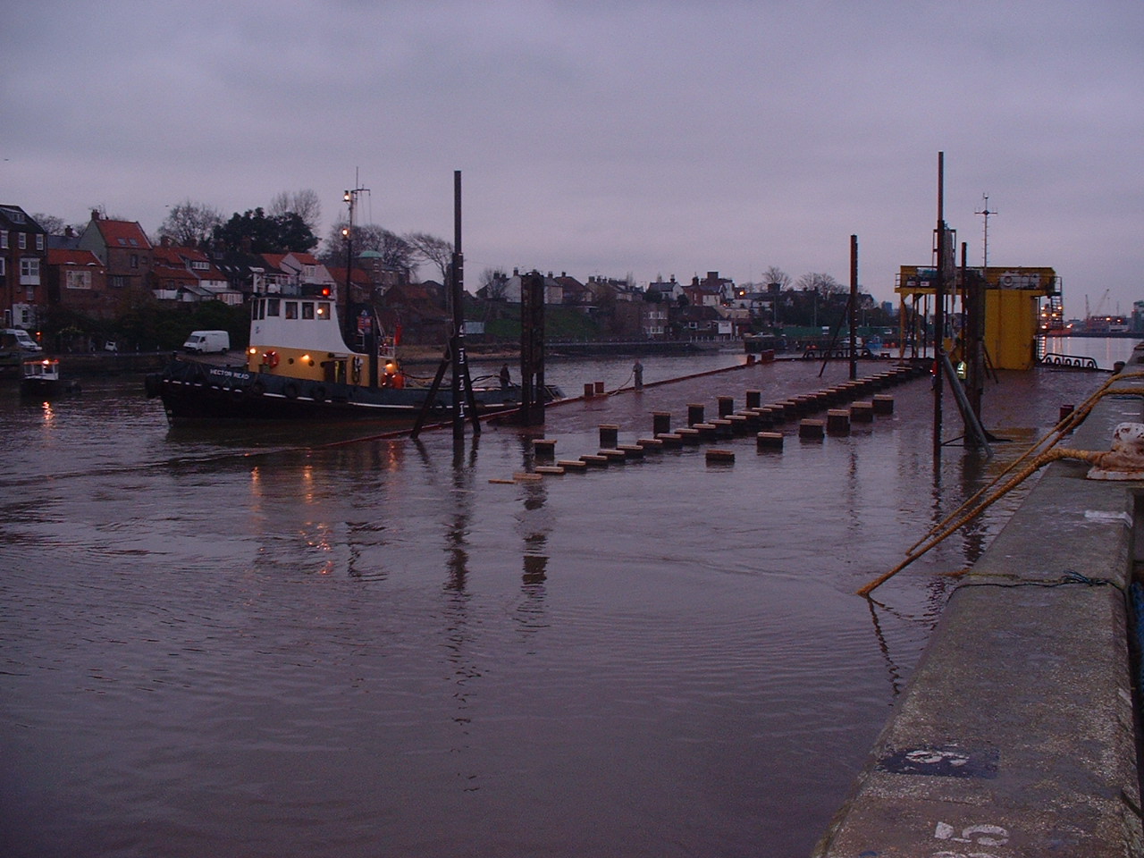 On the barge in the cold light of day. The river is too narrow adjacent to Prior's yard, so this stage is taking place further downstream.