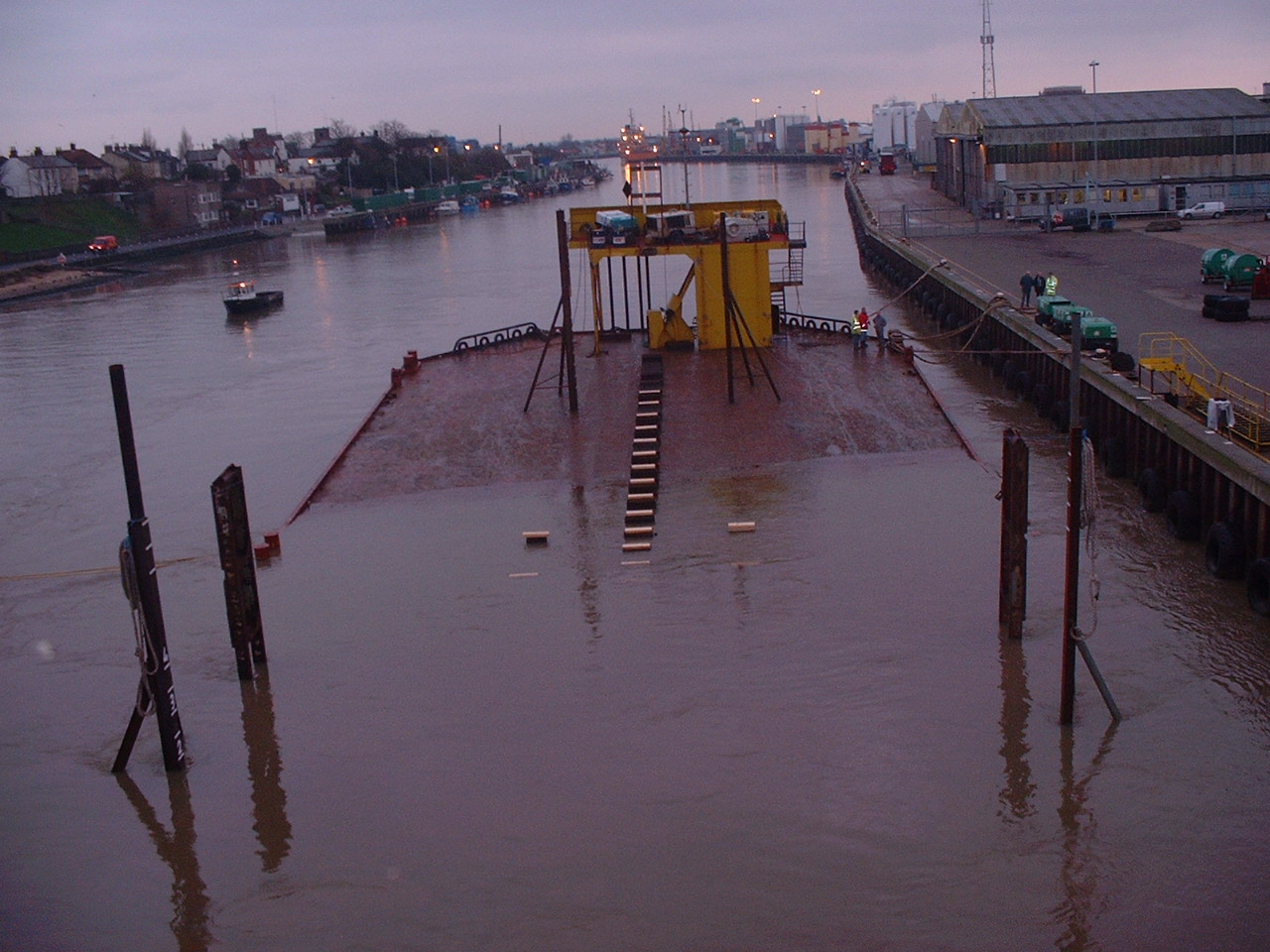These photographs of the initial barge operation show the sinking of the barge and Waverley being moved over it. Unfortunately the light conditions were not sufficient to enable recording of the barge lift.