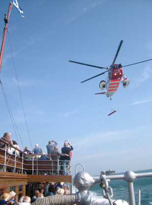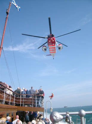 After rounding Bembridge Ledge, Coastguard helicopter Whisky Bravo came up on the paddler and the winchman held up a large sign "67." Then the crew carried out an exercise, landing a crew member on the poop deck, passing small orange bags back and forth, running out a messenger line, lowering a stretcher using said line and finally recovering the stretcher and crew member.