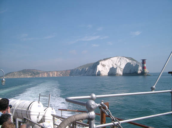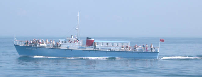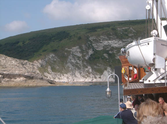 Nearly 300 were on board leaving Portsmouth and a further 100 or so joined the ship at Yarmouth. At Bournemouth both Bournemouth Belle and Dorset Belle were also alongside the pier. Unfortunately there was quite a bit of firing going on at the time - indeed we could hear frequent rumblings booming out to sea - so the paddler had to keep well out to sea, clear of any stray shells! However, we did get a very good look at Lulworth Cove and Durdle Door before turning out to sea and cutting across to St Alban's Head.
