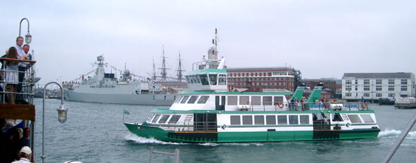 The Gosport ferry Spirit of Portsmouth crosses in front of a visiting Chinese warship with the masts of HMS Victory in the background