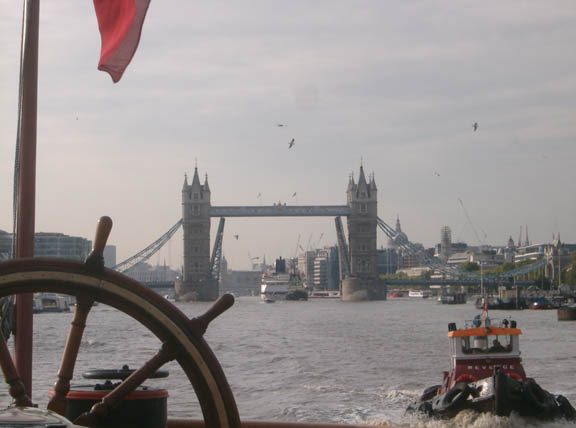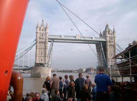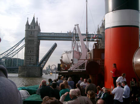 Approaching Tower Bridge, commentator Roddy McKee told us that we would be sharing the bridge lift with the Hapag-Lloyd cruise line Bremen. Waverley passed her bow line to tug Revenge down stream of the bridge to pass through and swing immediately she was clear of the towers. Captain Colledge sounded four blasts followed by one as the sound signal for "I am going about to starboard."