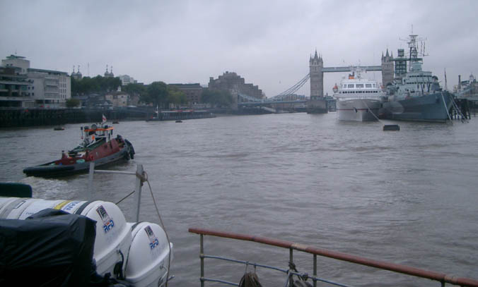 Tug Revenge swings the paddler just below London Bridge. Cruise liner Hamburg is berthed alongside HMS Belfast.