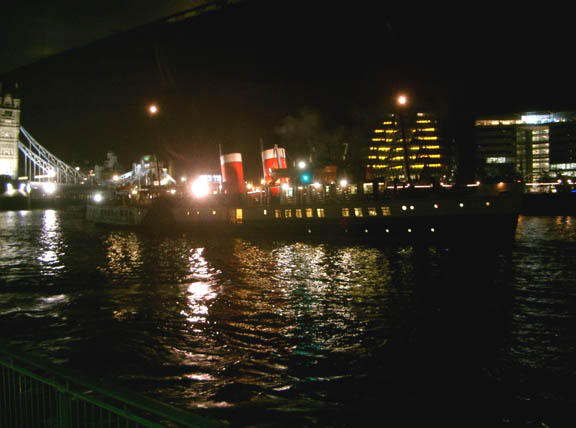 Although the steamer was to lay overnight at Tower Pier, she had to leave her berth about 30 minutes after docking in order to allow Silver Bonito in to disembark her passengers. Tug Revenge took the strain as the pair stemmed the tide while this took place. As soon as Silver Bonito had cleared the tug started working the paddler gradually back into her berth.