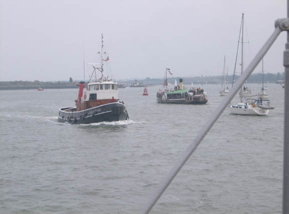 Then the steamer turned south for the River Medway for a prolonged rendezvous with Kingswear Castle. The first pass was while we were waited for the tug Christine to push us round. Heading downriver, the Waverley overtook her smaller consort before KC went around Waverley's stern and overtook her in turn. By now the pair were approaching Kingsnorth Power Station as KC got a clear lead allowing Waverley to get back on her port side and overtake again and finally head back for Southend. Each pass was accompanied by whistle blowing and cheering, the later led by the rival commentators, Jeremy Gold on Waverley and Roddy McKee on KC.